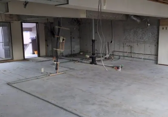 14階マンションの1室の内部解体工事。風呂、トイレ、台所、壁等全てを躯体にしてリホームする工事です。上下、左右の住人が居るので気を使う工事でしたが、挨拶養生をしっかりとし完工しました。